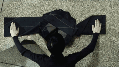 从一张平铺在桌面上的折纸,通过手工摆弄,瞬间从二维变成了三维的形态。——这便是“折纸”系列来源的根本。事实上,这与三宅最初的“一块布”的灵感有着异曲同工之妙,借助用“身体去穿服装”——把“身体”潜移默化地视为“摆弄‘那张纸’的媒介”,通过这种方式将布料进行改变,从而最终成为如今我们所看到的服装的姿态。